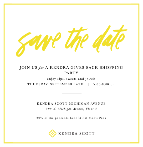 Join us for sips, sweets and light bites at a “Kendra Gives Back” event with Kendra Scott at her downtown Michigan Avenue store — 20% of all sales from in-store purchases that evening (and from phone orders taken at anytime that day) will be donated to Pat Mac’s Pack.