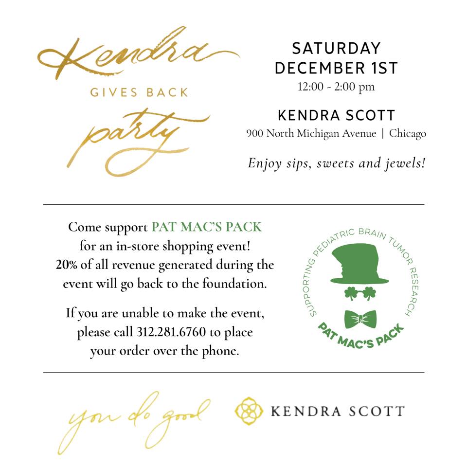 A perfect opportunity to pick up some special holiday gifts, join Pat Mac’s Pack at Kendra Scott’s Michigan Avenue store (or place your order over the phone) on December 1, and 20% of your purchase will benefit Pat Mac’s Pack.