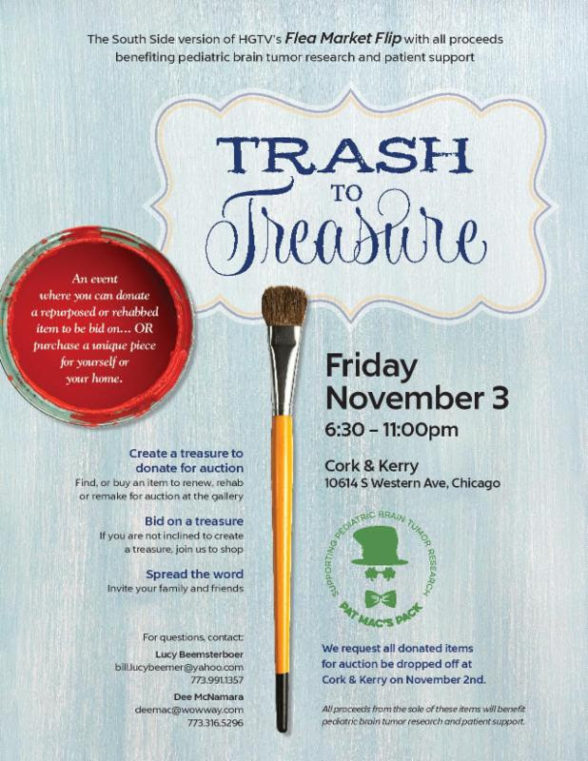 Create a treasure to donate or auction. Find or buy an item to renew, rehab or remake. Drop off your treasures at Cork & Kerry on Thursday, November 2, anytime after 2pm.